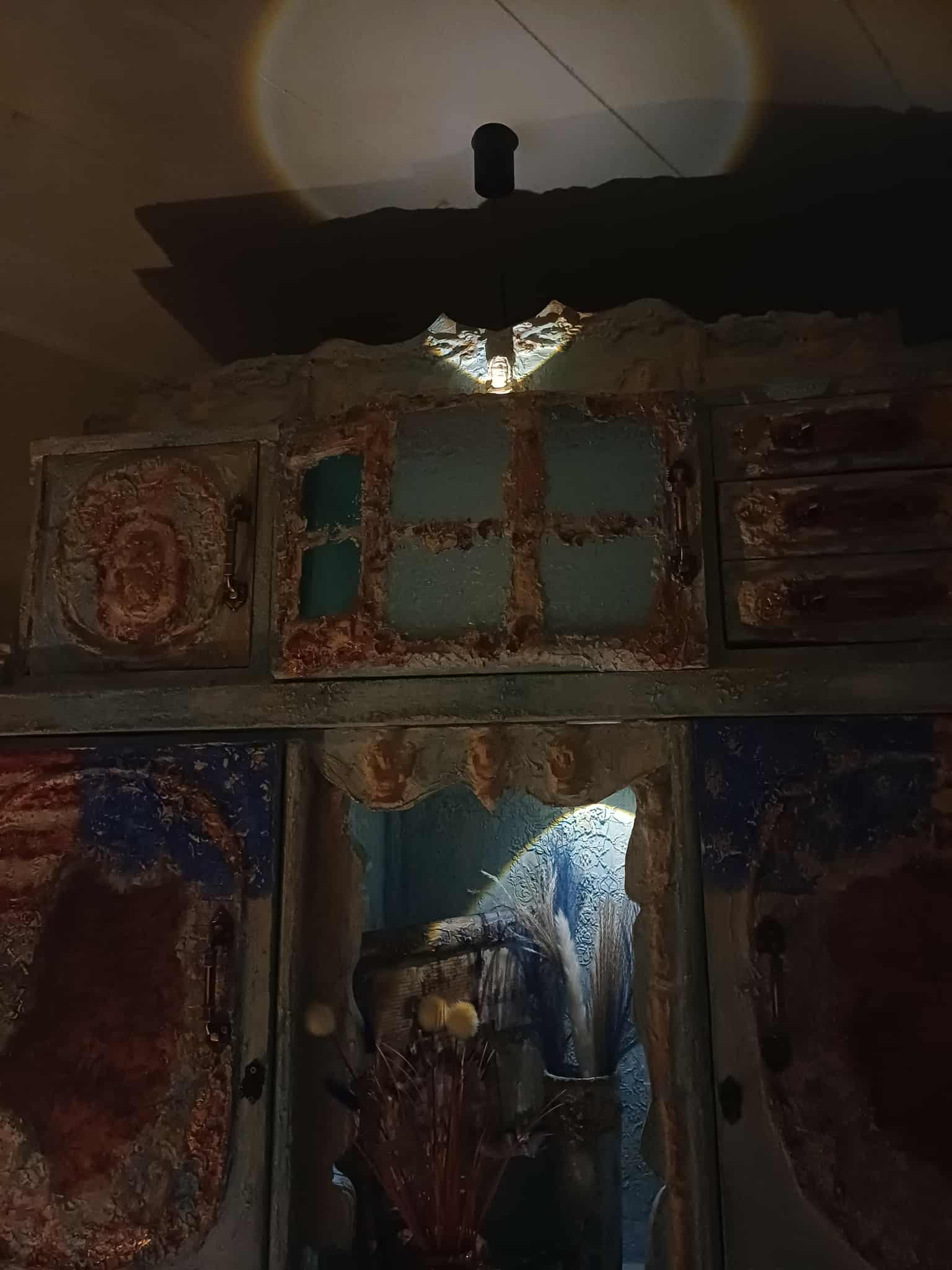 A stunning and ultra-exclusive Boho antique-style cabinet, handcrafted and designed as a unique statement piece for an elegant interior. The cabinet measures 2 m in height, 2 m in width, and 43 cm in depth. For safe transportation, it will be shipped in two pieces, with the top section fitting securely between the borders.